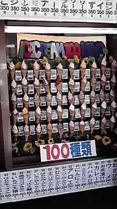 ←錦帯橋の根元にあった100種類ものアイスが売っているお店むさし。KAITO兄さんたぶん大喜び(笑)下のメニューに注目。ニンニクとかハバネロ味のアイスも…… 大人しく夏みかん&ピーチを頼みました。